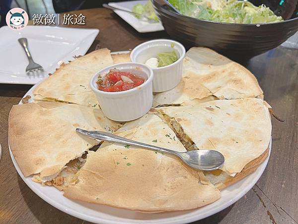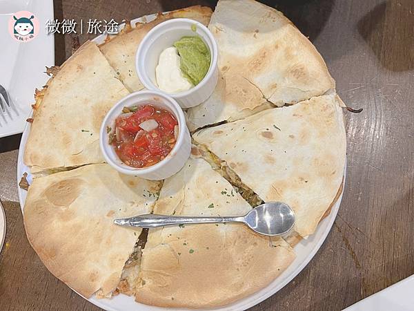<墨西哥牛肉薄餅>薄餅意外的很好吃,裡頭的牛肉不會太老,還有附上兩種醬料沙沙和酪梨醬,大家分著吃很適合