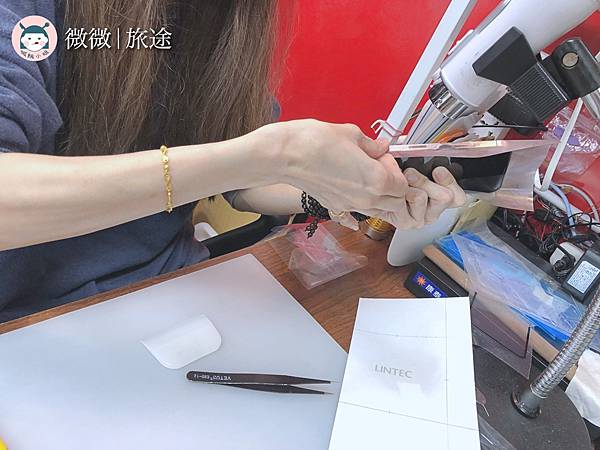 看的出來很專業,才一下子就貼好了,也會再給你檢查,確認都沒問題!才繼續進行包膜哦~建議大家包膜需要的時間比較長,可以先跟店家預約,避免在店內等候的情況囉!