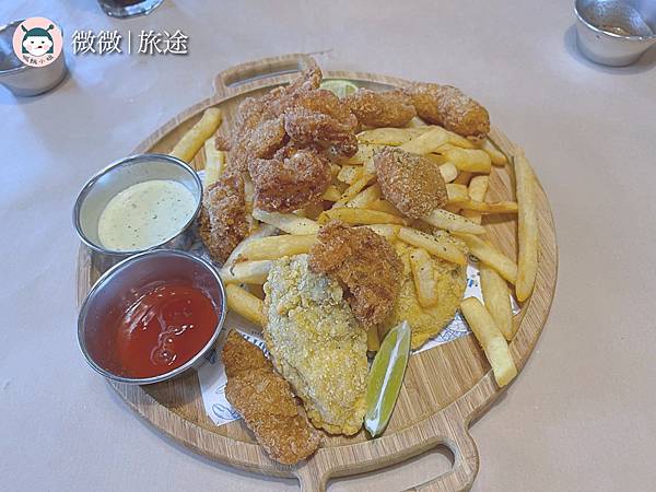 <老船長炸物拼盤>裡面有炸魚跟牡蠣的海鮮配上薯條,炸魚跟牡蠣都沒有腥味!