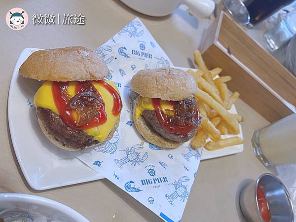 <起司牛肉漢堡>漢堡是小漢堡那種,很方便分食,個人很喜歡上面醃製過的甜甜洋蔥醬,還有附上薯條囉