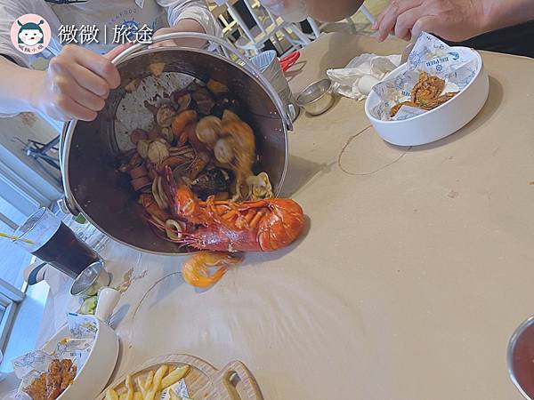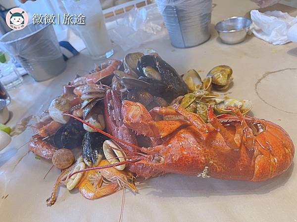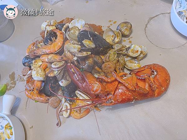 <龍蝦桶>重頭戲登場的海鮮,就這樣倒在桌上啦~裡頭有波士頓龍蝦🦞淡菜、活牛奶巨蛤、大白蝦、魷魚🦑還可選擇想要的配菜和醬料。