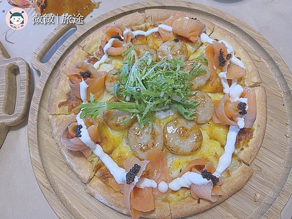 <魚子醬燻鮭魚干貝披薩>個人是鮭魚控,這道絕對是我自己最喜歡的,起司配上鮭魚干貝🐚超級滿足的啊!重點還有魚子醬,是黑色的呀!一口吃下去,滿滿的鮮味在嘴巴,超滿足😍