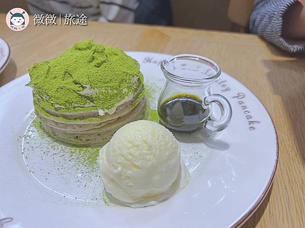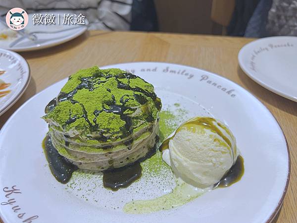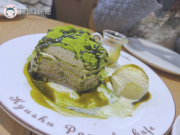 <九州抹茶提拉米蘇鬆餅>接著上桌的是另一款提拉米蘇系列的鬆餅,日式當然不能錯過抹茶。旁邊的抹茶醬可以淋上去,看起來是不是整個讓人更想嚐一口了