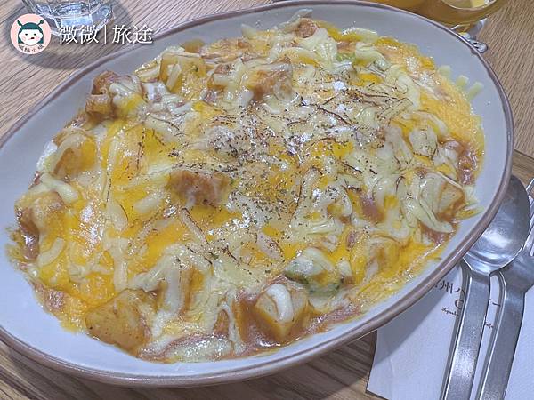 可以看到只是挖上一口,就牽絲,每一口都可以吃到起司,裡頭的雞肉切成塊,口感還好,不會到嫩的很驚艷那種,但日式咖哩的口味很不錯