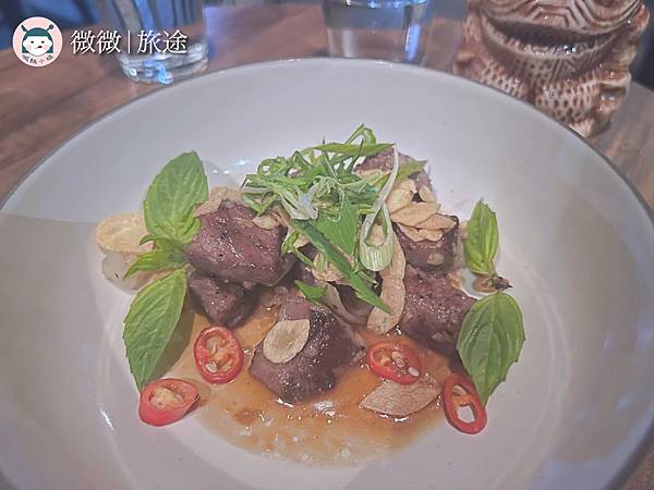 <美國頂級骰子牛 橄欖油煎蒜片 特製醬汁>有點台式熱炒的精緻版,骰子牛很剛好的熟度,配上九層塔及蒜酥辣椒,這個下酒菜也太幸福了吧!