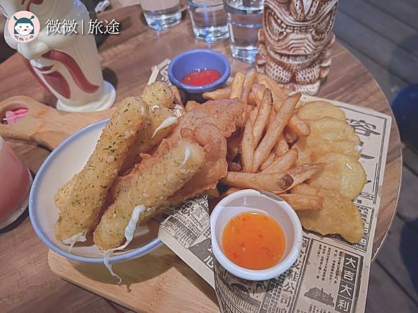 <炸物拼盤 起司條 薯條 炸魚 雞塊>炸物拼盤還蠻大的,種類很多樣,炸得很酥脆囉