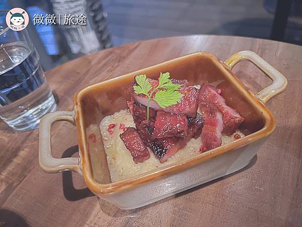 <烤楓糖培根 馬鈴薯泥>接下來就是我自己個人最喜歡的,個人覺得比較有特色,培根外糖焦化的脆口,甜甜的,配上下面的馬鈴薯,吃完真的意猶未盡!