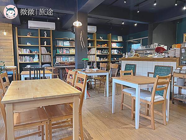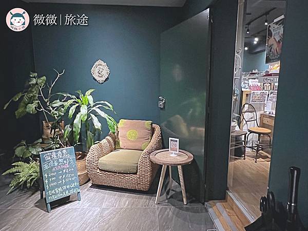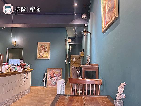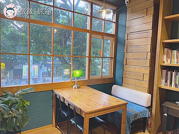 一走上二樓可以看到木桌椅,搭配墨綠色調很沉靜的感覺。