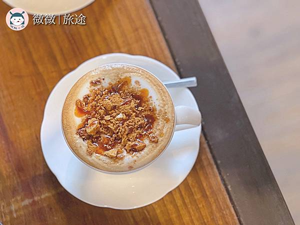 <韓式焦糖脆餅拿鐵>這個超級有特色的,上面有焦糖脆餅可以挖起來單吃或是等它整個融在熱拿鐵裡,口味就會比較甜哦