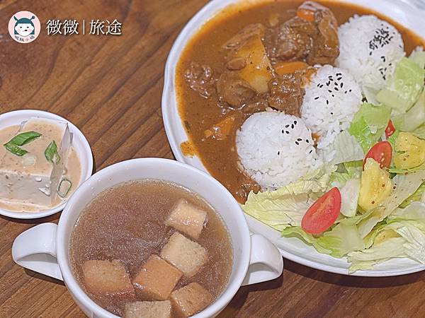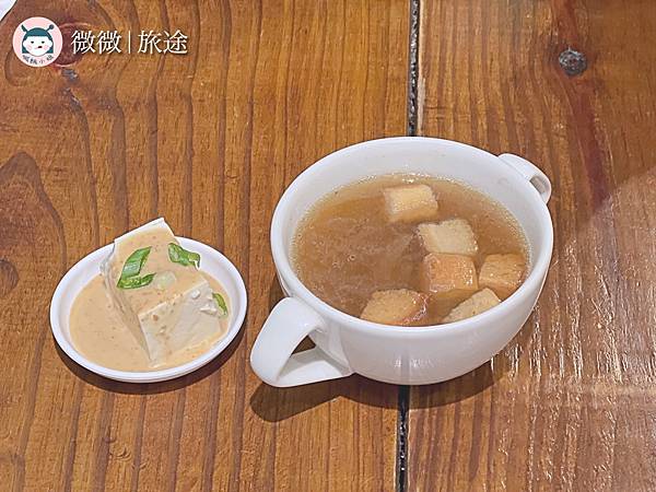 主餐都有附上湯品和小菜,剛好遇到洋蔥湯,比較清湯型,小菜有兩種可以挑選,我們選了胡麻豆腐。