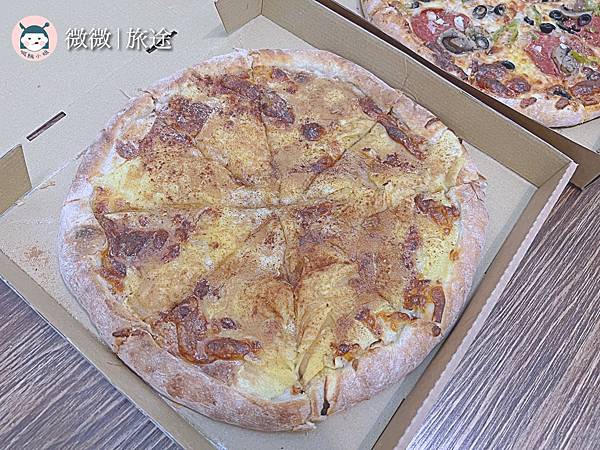 <焦糖蘋果肉桂>自己其實後來蠻喜歡甜的披薩,第一次吃焦糖蘋果肉桂口味,吃起來甜甜的,但不會過甜,面皮香香的,咬起來很Q~
