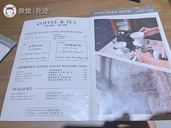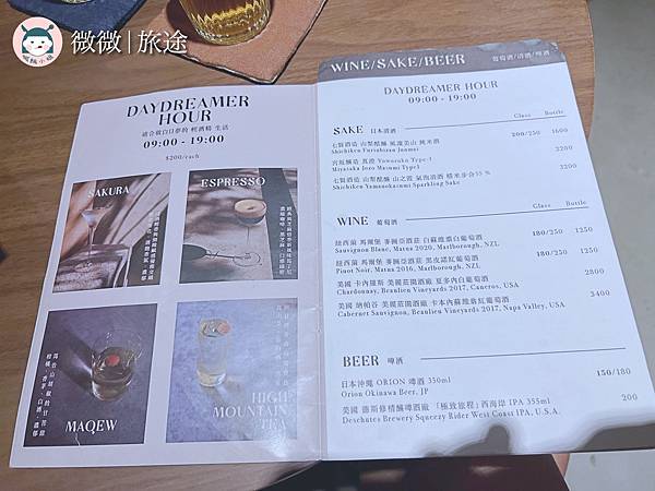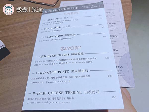 完整的酒單我放在最後面,給有需要的人參考囉~店家不同時段提供的飲品不一樣,白天還有提供咖啡果汁類,晚上主要都是酒精飲品囉!跟配酒的小點!