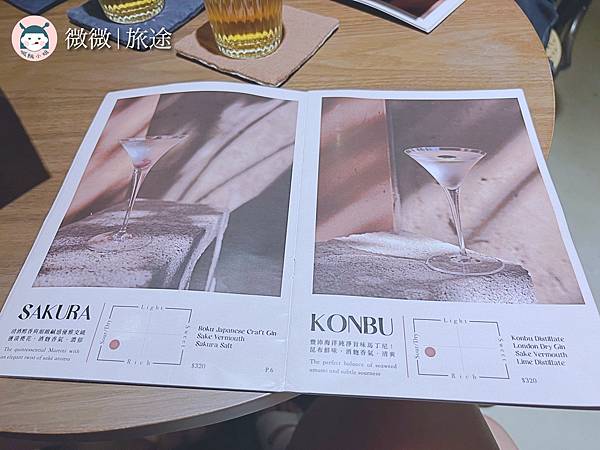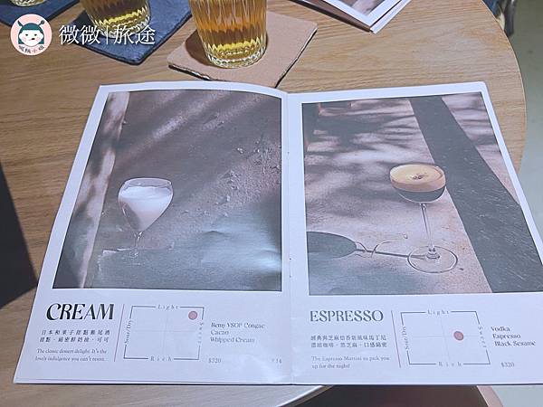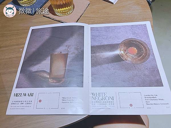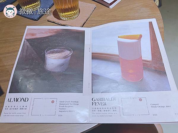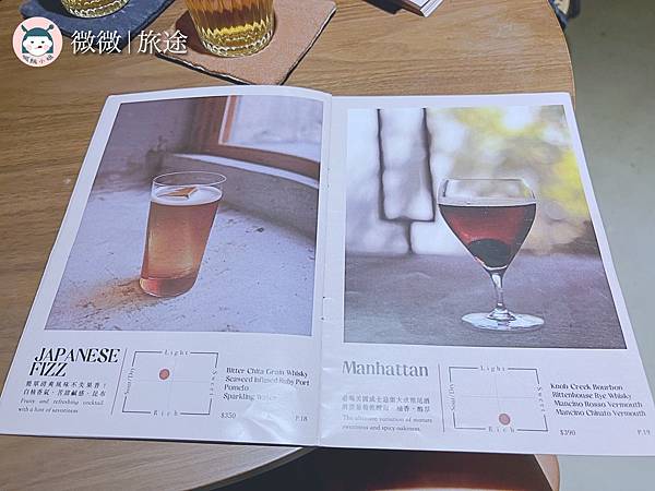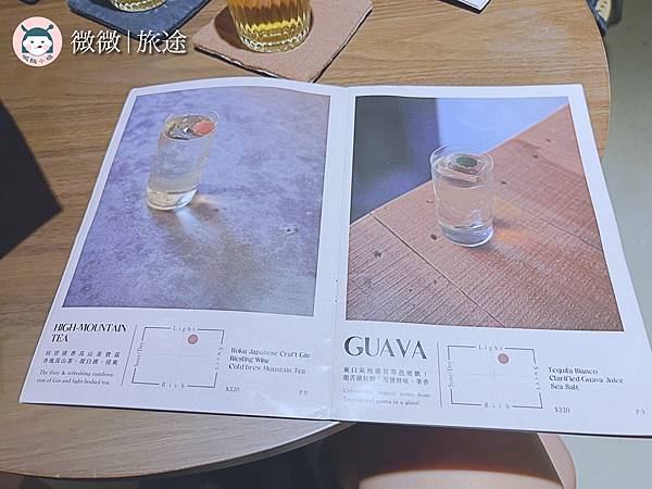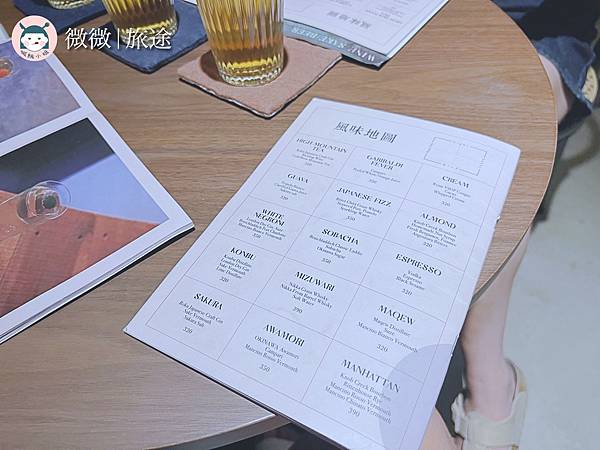 我覺得最特別的是這張風味地圖!有沒有人跟我一樣是酒吧小白,很少去酒吧對於酒類的名字超級不熟悉跟了解,透過這張指南,可以從喜歡酒感重一點或是偏甜偏酸,上面都有幫你畫好了~菜單酒類飲品下面也有小框框,標示這是在哪一區,超級貼心的![]()