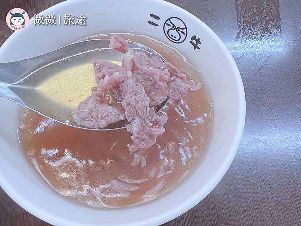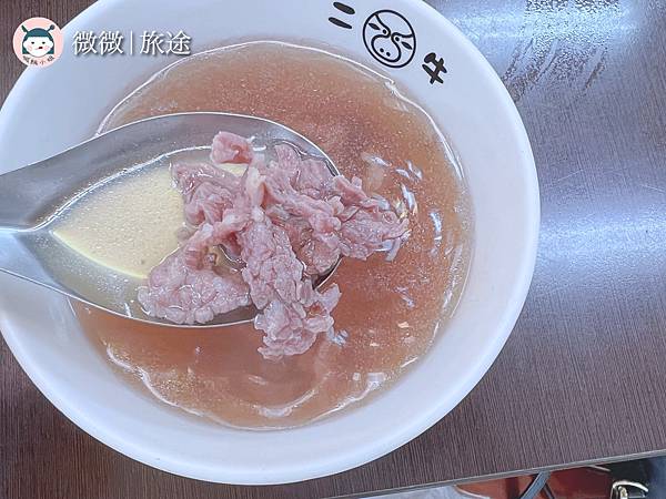 <牛肉湯 小>先來看這個粉嫩肉的牛,條狀切吃下去比較有咬勁的口感,湯帶有一點甜味,我自己喜歡加薑絲,然後肉可以再沾辣醬哦!