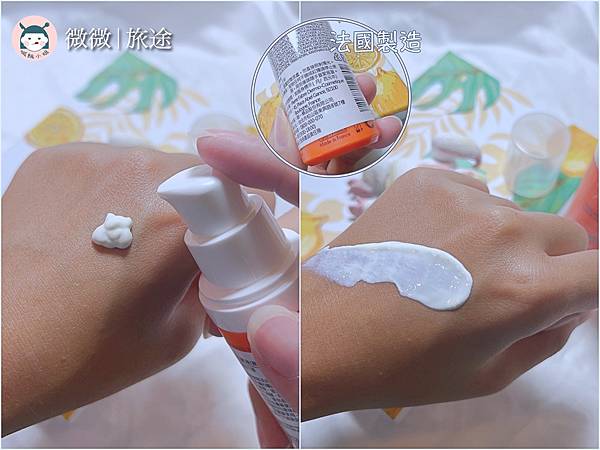 可以看到瓶身就印著法國製造的字樣,個人覺的防曬產品其實在防曬效果和清爽間要取得平衡,真的蠻難的!手背上推開,質地厚重,但蠻快就轉為乾爽😲等不及來試一下!