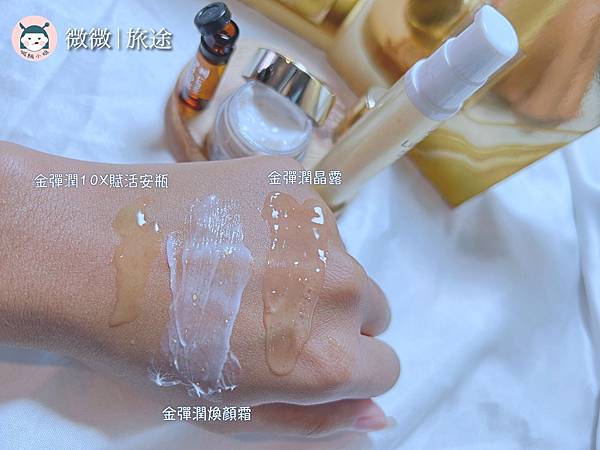 裡頭從左邊有安瓶、精華露、面霜!先來手臂上給大家看一下質地!有沒有看到也隱約在發光的東西~