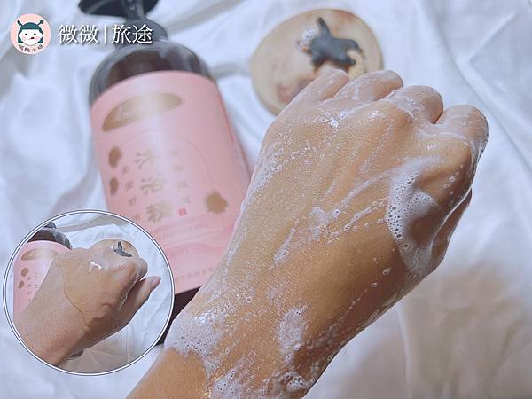 不要激動,為了大家的眼睛著想,沒辦法洗澎澎給大家看,以手背上當作示意圖囉~質地是膠狀的,一壓就可以聞到甜甜淡雅的香味,不知道有沒有人跟我一樣,選沐浴乳很注重香味,很怕那種香的嗆鼻的!