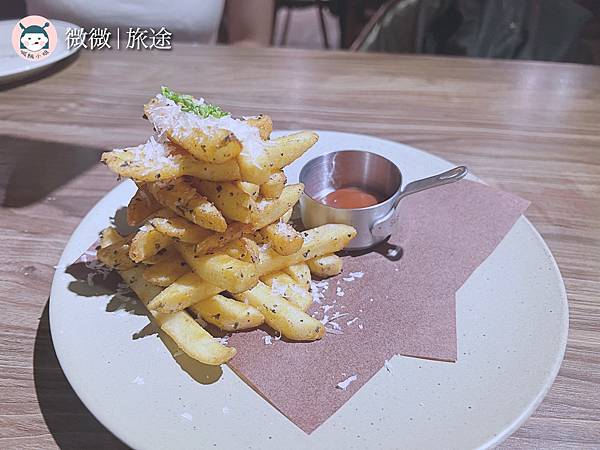 <帕瑪森松露脆薯>我們點的威靈頓牛排有附餐松露薯條,上面香香的帕瑪森起司,個人是松露愛好者,貪心的希望可以再多一點囉~