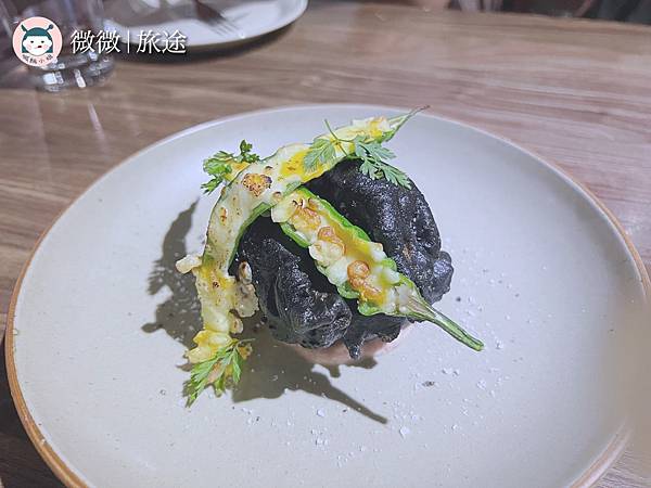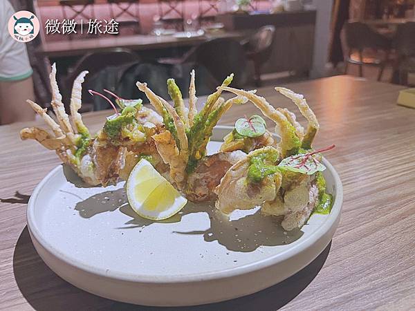 <酥炸軟殼蟹>這道菜也是吃得超滿足,光上桌的覺得擺盤很用心,上方配上香草青醬,配上檸檬汁帶點酸解油炸的膩,軟殼蟹真的很適合我們這種懶人,不用剝殼又有脆口的外皮
