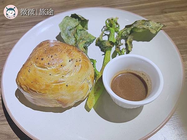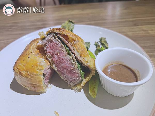 <威靈頓牛排>接著就是自己最期待的牛排上桌啦~搭配紅酒醬,裡頭的牛肉,外面裹上馬鈴薯跟醬汁和像酥皮濃湯外皮的麵包皮,下去烘烤,裡頭的牛肉不乾柴,還有肉汁,配上紅酒醬~感覺超級費工,很特別!