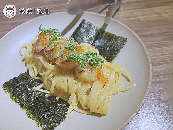 <北海道干貝鱒魚卵海膽醬義大利麵>自己私心很推薦這道義大利麵,上頭的干貝煎的剛好,醬汁超級特別,有點日式的海膽鹹味道,配上海苔,很特別的口味