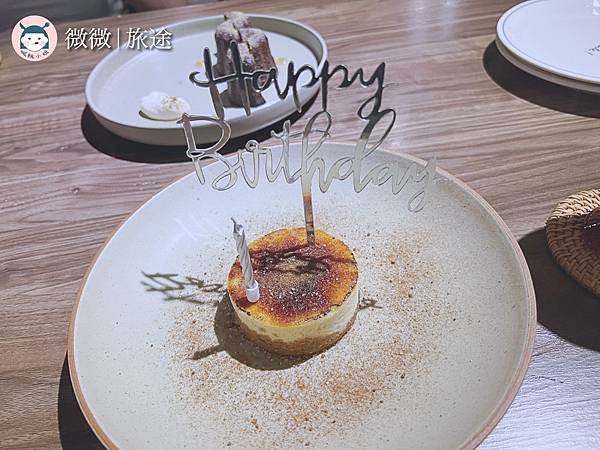 <脆糖肉桂起司蛋糕>上頭的脆糖很像我愛烤布蕾的焦糖,再撒上肉桂糖粉,來慶祝生日,店家還很用心的準備了蠟燭跟生日裝飾~