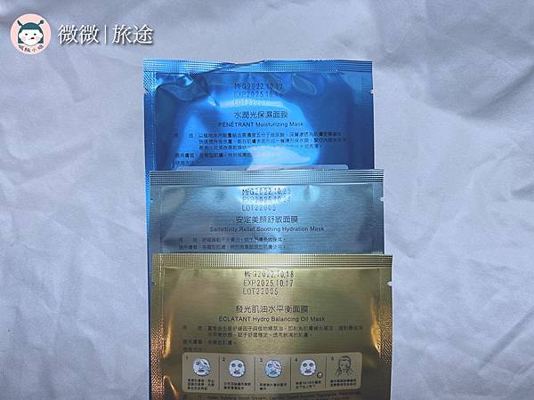 面膜選用「棉質纖維」,很輕透服貼,不會亂翹。取下來後,舒緩了原本洗完臉後的乾燥緊繃感,肌膚變QQ彈彈的。一共有三款針對不同的功效可以選擇。