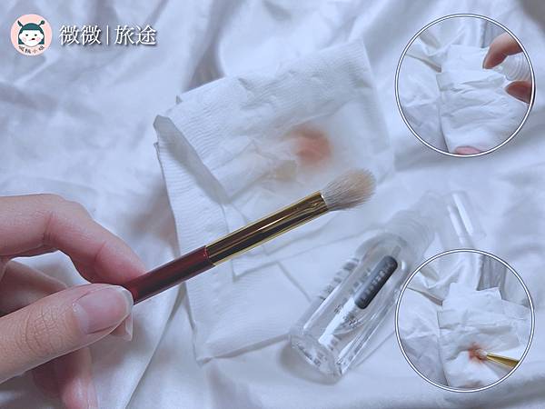 畫完後,馬上使用這個噴霧清潔,只要噴在紙巾上,然後刷子在畫圓,本來還很懷疑怎麼有辦法,但一下子殘妝的顏色都在紙巾上了,真的超級神奇!