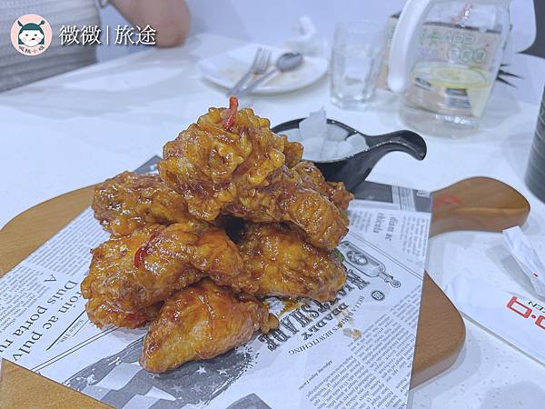 <半半炸雞-蜂蜜蒜味炸雞>跟我們一樣貪心的人,可以各點一半不同口味的炸雞,蜂蜜蒜味吃起來甜甜鹹鹹的,最喜歡是它的外皮,明明抹醬後,還是可以酥脆~