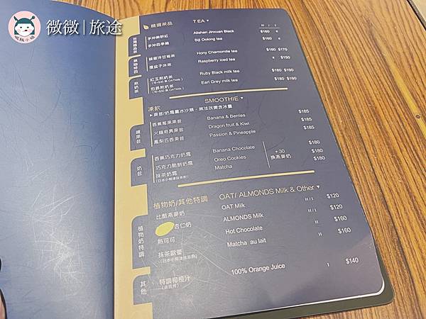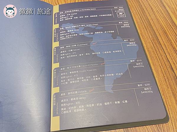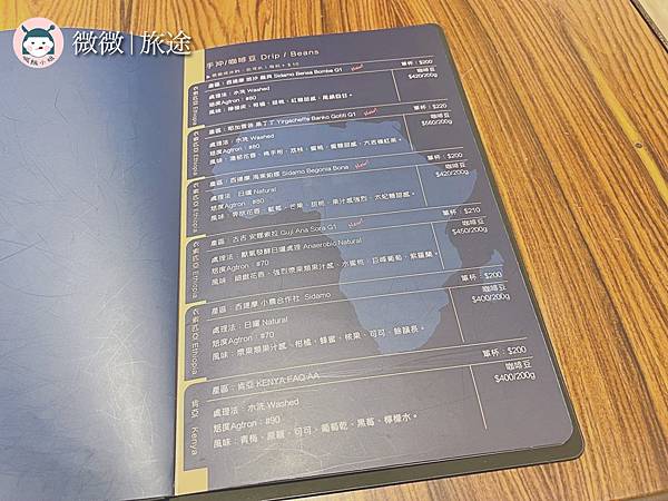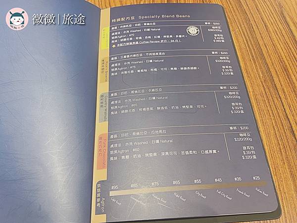 完整的菜單照慣例放在最後,店家有低消,一般是沒有限制時間的,除非客滿就為兩個小時為上限囉!店家的咖啡豆的種類蠻多的,還有特別介紹在菜單內頁裡!