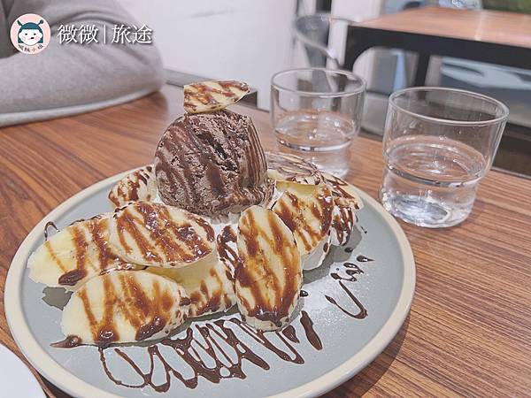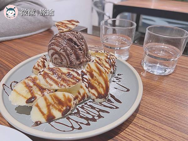 <巧克力可頌鬆餅>本來對於菜單上的甜點可頌多拿滋很有興趣,可惜當天沒有,小黑板上有當天限定的甜點,是可頌鬆餅,看到滿滿的香蕉配上巧克力冰淇淋,感覺口味不會錯呀~吃起來有點像是可頌放進鬆餅加熱的樣子!