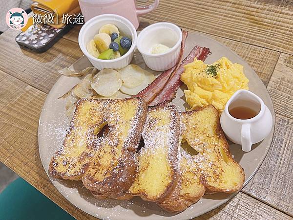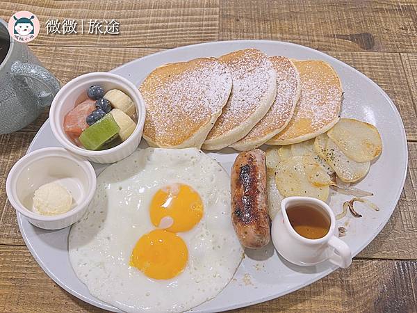 <檸檬瑞可塔鬆餅>自己實在無法錯過鬆餅類的早餐,立馬點來試試看,是小圓煎餅,裡頭有帶點檸檬酸甜的香氣,個人蠻喜歡的,不像傳統美式鬆餅就是楓糖甜到底!配菜的水果蠻豐富,炒馬鈴薯、太陽蛋~很豐盛滿足!