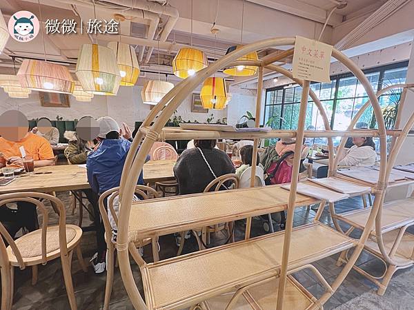 可以看到用竹籠麻布似的配色,還有木製的椅子,剛剛說的帶點南洋風,有一張大桌子的低座位,或是環狀的沙發座椅~