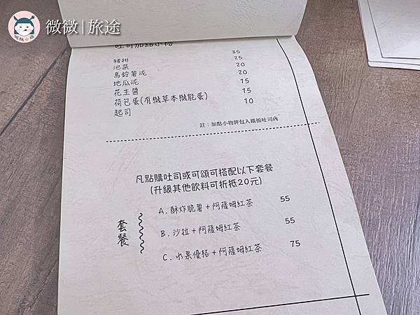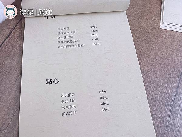 完整的菜單照慣例放在最後,店家的早午餐大部分都是早餐盤,麵包類的東西,還有點心炸物類!低消是一人一百,用餐時間九十分鐘哦!