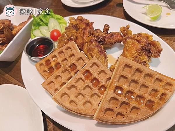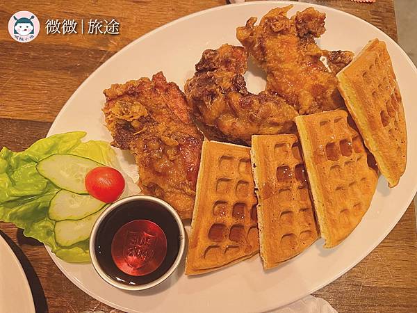 <楓糖炸雞鬆餅>接著就是我自己私心最愛的一道,淋上楓糖的炸雞,炸雞內肉很嫩,鬆餅內鬆軟外脆,推推😍