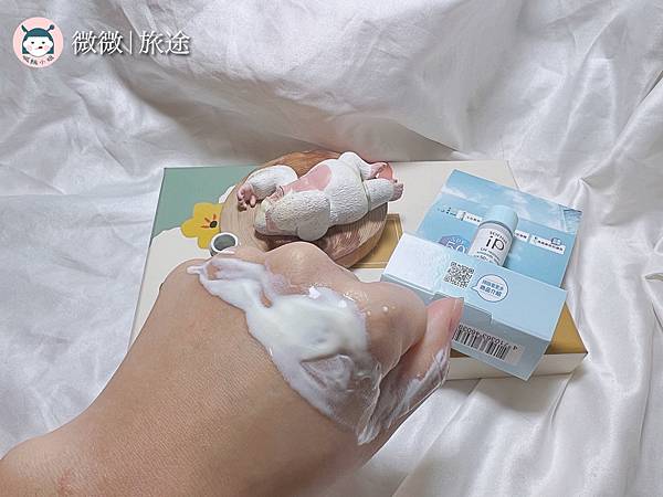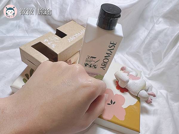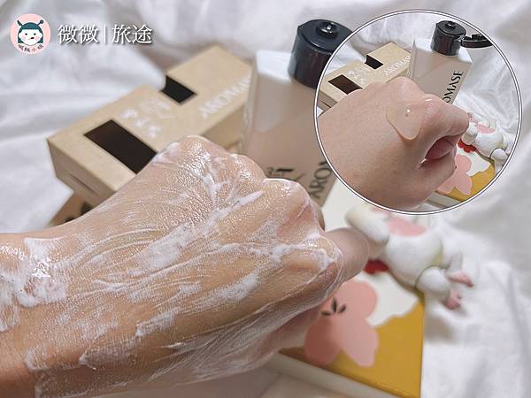 這款有三種味道,我的暖陽玫瑰,本來很擔心是刺鼻的化學味,但這款味道很溫和舒服~礙於尺度不能洗澡給大家看,用我的肌膚小手手當作示意!均勻搓揉起泡後,再用清水洗掉~