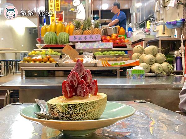 很快的冰品上桌,實在長得太可愛,草莓淋上煉乳,下面配上哈密瓜的組合,吃下去非常消暑哦~