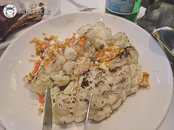 <香料鹽烤花椰菜>這道花椰菜下面有甜椒,服務生很貼心的提醒,如果是不敢吃得記得避開哦~烤的熟度很剛好,吃起來味道很特別,整個不會形容,配上切碎的甜椒