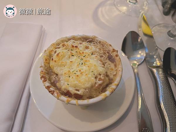<洋蔥湯>湯的份量其實蠻大的,可以請餐廳幫你分成兩碗裝,超喜歡上面焗烤配上麵包,沾滿洋蔥湯汁