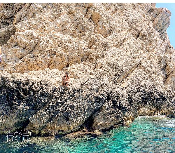 第二天我們起個大早,前往集合地點,迎接出海行程。兩個高大的船員是今天整日的依靠,一位船員負責導覽跟開船,時而停下帶我們觀看特殊的岩石景觀,其中帶我們到一個特別的島嶼,因為沿岸水面深度不夠,唯一上岸的方式是游泳過去,船員悠悠的說出這段話,突然大家開始手忙腳亂,一些人穿上救生衣,邊緊張的不知道有沒有穿、對有沒有都扣緊,甚至說出:「那可以不要下船嗎?」,其實也有準備小小的橡皮艇,讓不會游泳的人搭乘,這時大家才鬆一口氣。我早已脫下衣服跳入海裡,緩慢的游上岸。上岸後有些人躺著做日光浴,有些人買杯咖啡啜飲,我們拍拍照走走。準備前往下一個點,帶我們到一處岩石像跳台一樣,需要先游過去,攀爬上岩壁,一上去居然有個小池子可以泡泡海水,裡頭的海水清澈帶點淡淡的綠,接著沿著岩壁走來到可以跳水的地方,雖然船員先示範了跳水的安全性,但當自己站上去時,反而很緊張卻步猶豫了一下,來自船上的加油聲,就這樣捏住鼻子,咚一聲的一躍而下,腦子完全不記得這墜落的幾秒中的景色,直到碰到海水的湛藍,才回神的划水游上岸,海水的藍真的很漂亮。接著前往另一個小島吃午餐,點了烤魚簡單吃休息。
