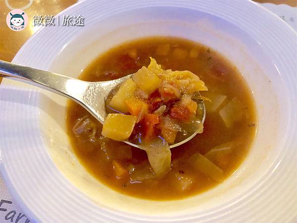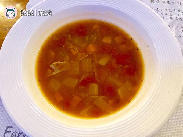<套餐-今日湯>番茄蔬菜湯屬於可以看到食材清湯那種,有胡蘿蔔、馬鈴薯...等蔬菜