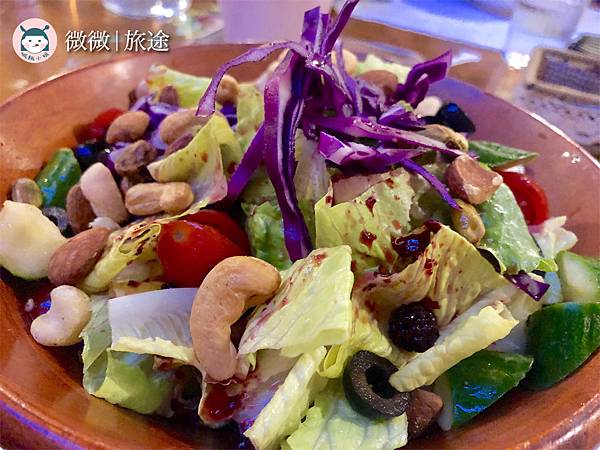 <單點-莓果油醋蘿蔓沙拉>單點的沙拉分量不小,上頭可以看到油醋醬料還有苺果顆粒
